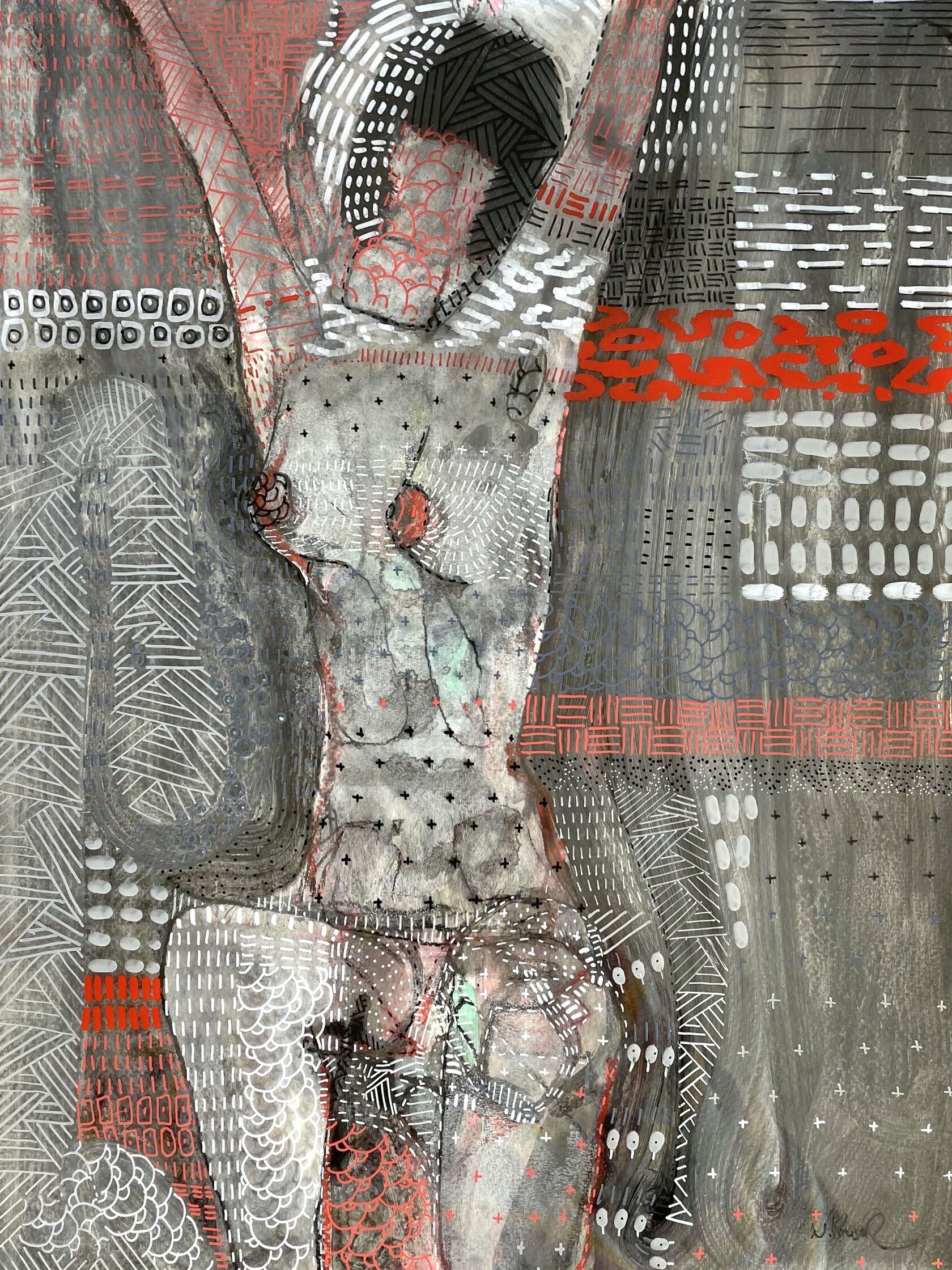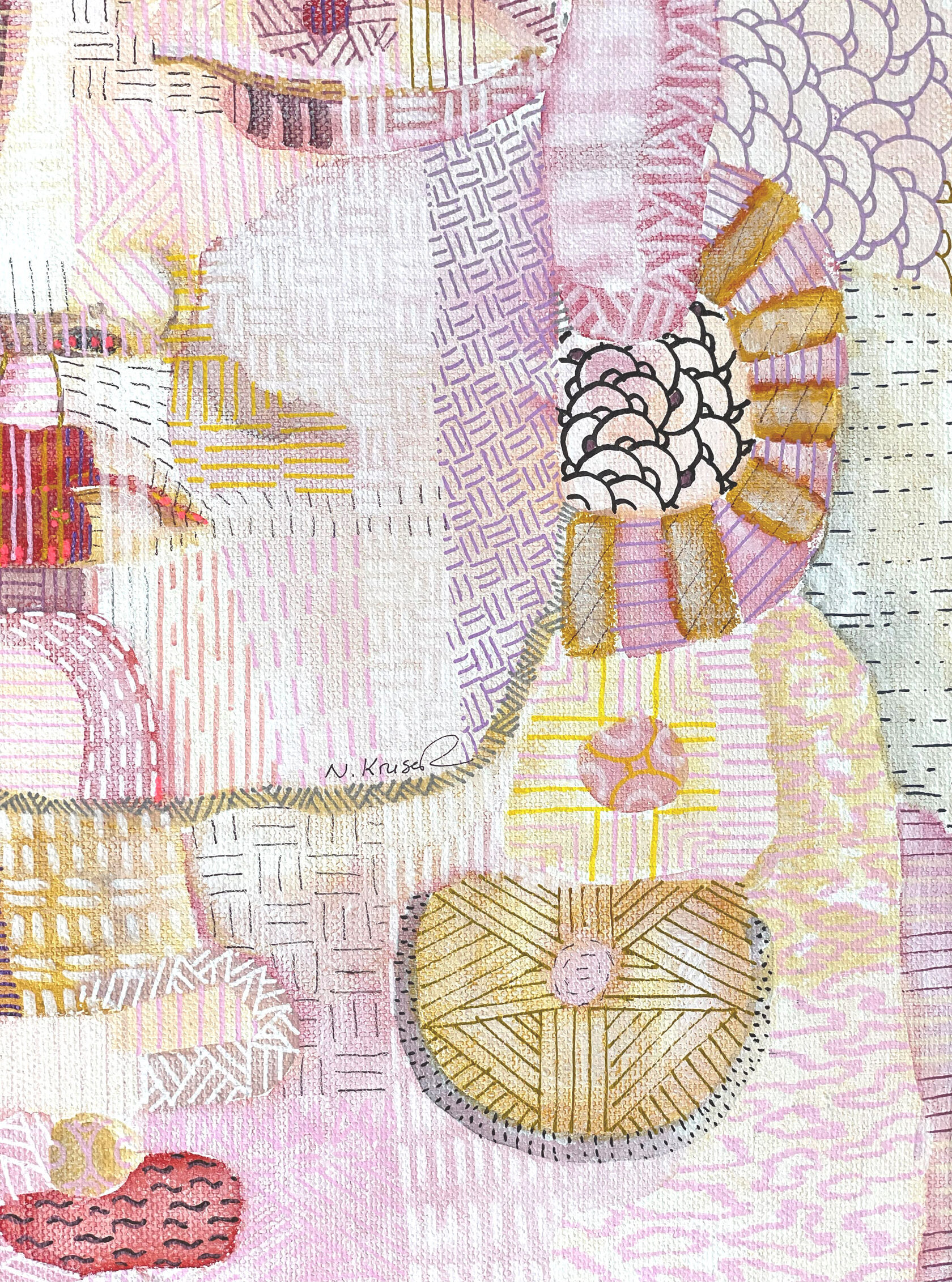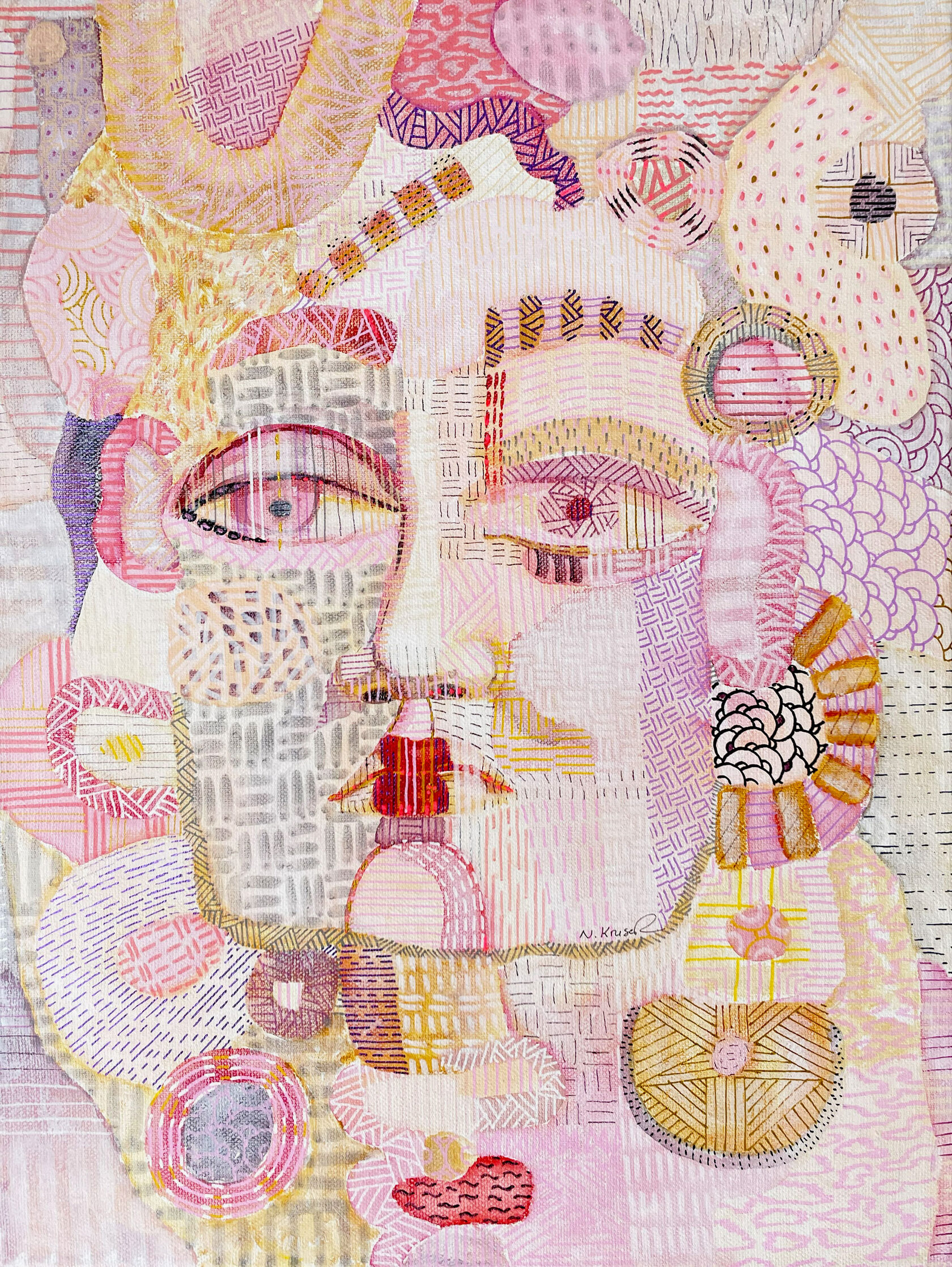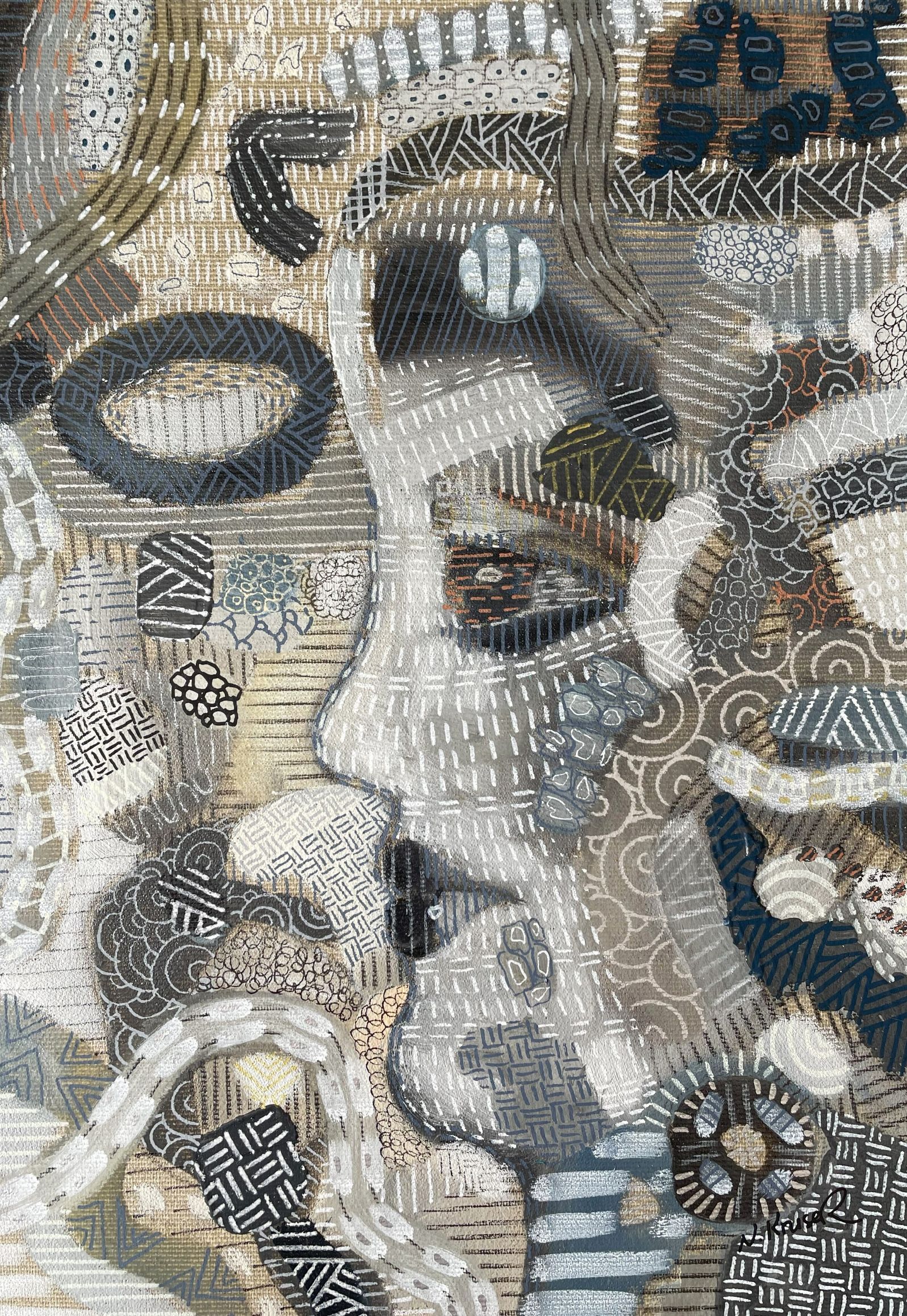 | über PAT in diesen Werken der Serien untersuche ich die vielschichtigen Strukturen menschlicher Erfahrung und Identität sowie den Einfluss der inneren Struktur auf die Welt um uns herum. [WIEDERKEHR] offenbart die Rückkehr des Überwundenen und die Zyklizität innerer Prozesse. [JA ORA NA] klingt wie ein Versprechen des Lebens, stellt jedoch die Grenze zwischen Entwicklung und Wiederholung in Frage. [LABYRINTH] greift den Archetyp des Weges als Form der Selbsterkenntnis und inneren Suche auf. [METAMORPHOSE] hält den Zustand des Übergangs, der Transformation von Form und Bedeutung fest. [EINGENÄHT–UMGENÄHT. EINGESCHRIEBEN] untersucht eingenähte und überschriebene Verhaltenskodizes, die sich im Gedächtnis überlagern. [KALEIDOSKOP] demonstriert die Vielfalt der Perspektiven und die Fragmentarität der Wahrnehmung. [WIR] verlagert den Fokus vom individuellen „Ich” zum kollektiven Körper. Zusammen bilden die Serien einen visuellen und konzeptuellen Dialog über die Wechselbeziehung zwischen innerem, kollektivem und umgebendem Raum. In these works from the series, I explore the complex structures of human experience and identity, as well as the influence of inner structure on the world around us. [WIEDERKEHR] reveals the return of the overcome and the cyclical nature of internal processes. [JA ORA NA] sounds like a promise of life, but questions the boundary between development and repetition. [LABYRINTH] refers to the archetype of the path as a form of self-knowledge and inner search. [METAMORPHOSE] captures the state of transition, the transformation of form and meaning. [EINGENÄHT–UMGENÄHT. EINGESCHRIEBEN] explores the sewn-in and rewritten behavioral codes that accumulate in memory. [KALEIDOSKOP] demonstrates the multiplicity of perspectives and the fragmentary nature of perception. [WIR] shifts the focus from the individual “I” to the collective body. Together, the series form a visual and conceptual dialogue about the interconnection between inner, collective, and surrounding space. |