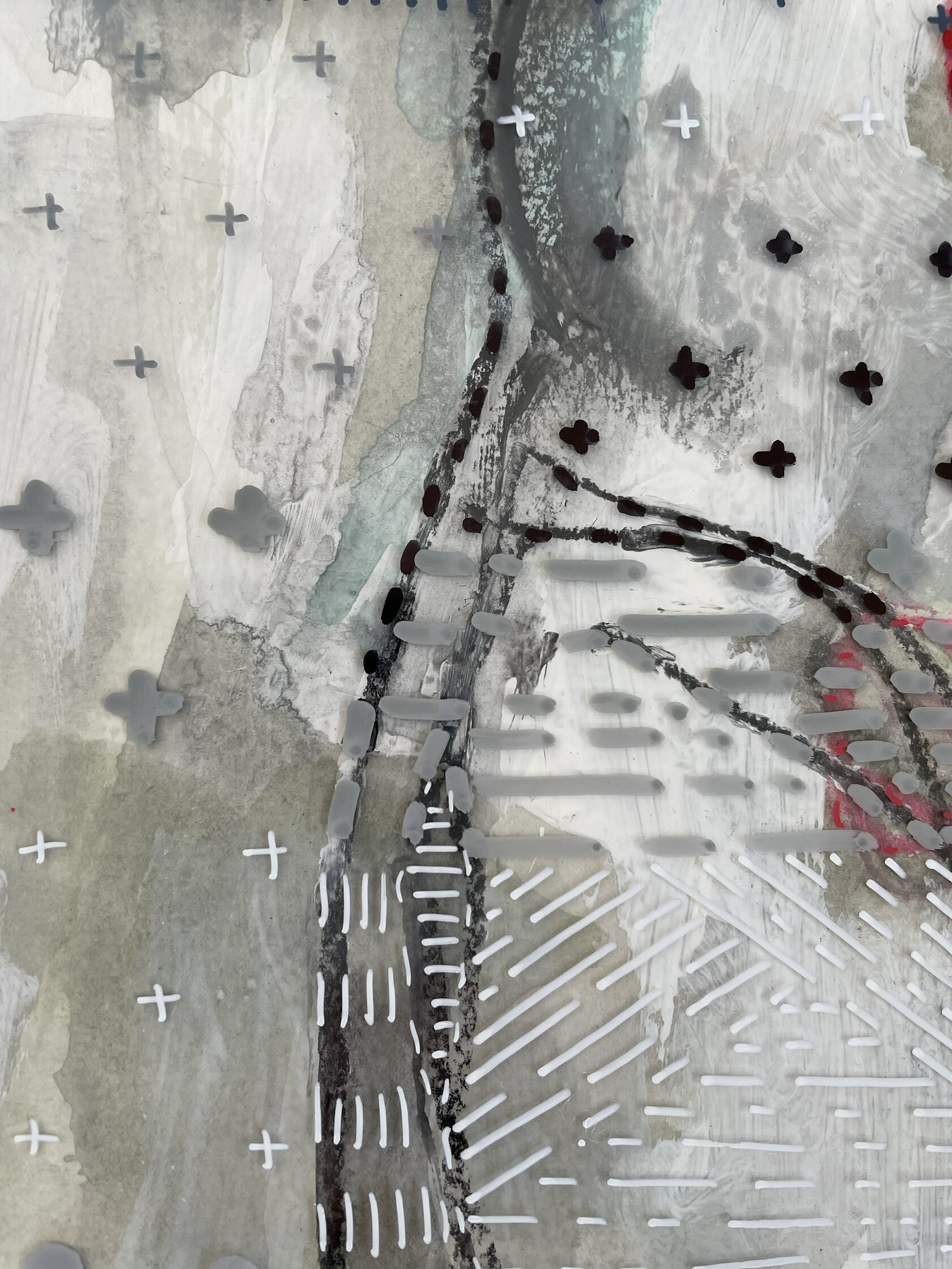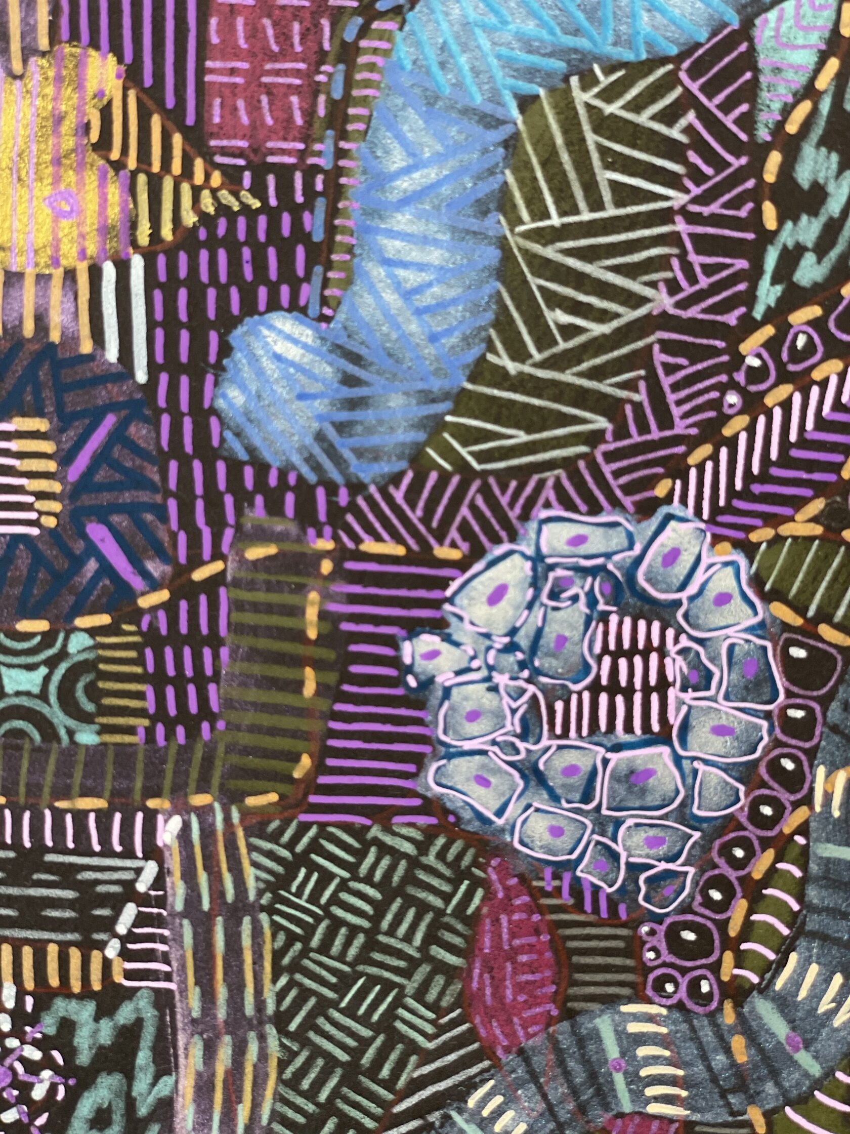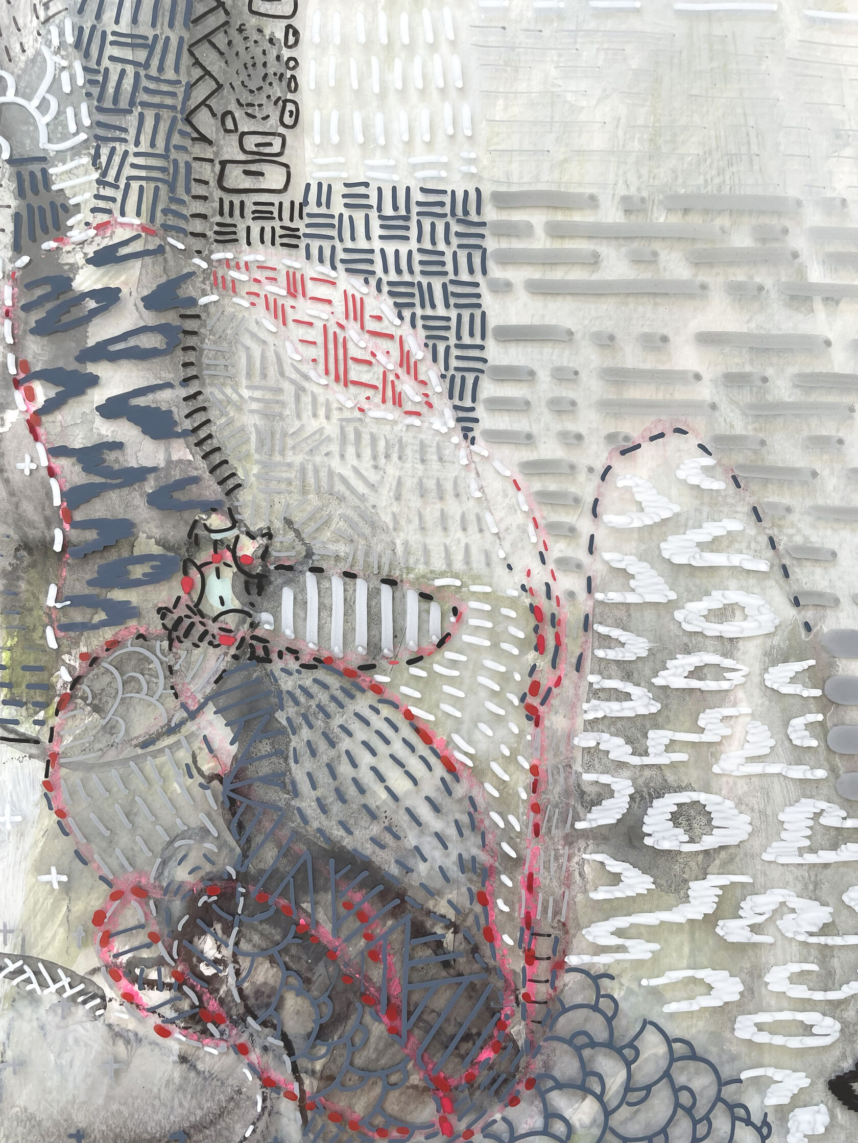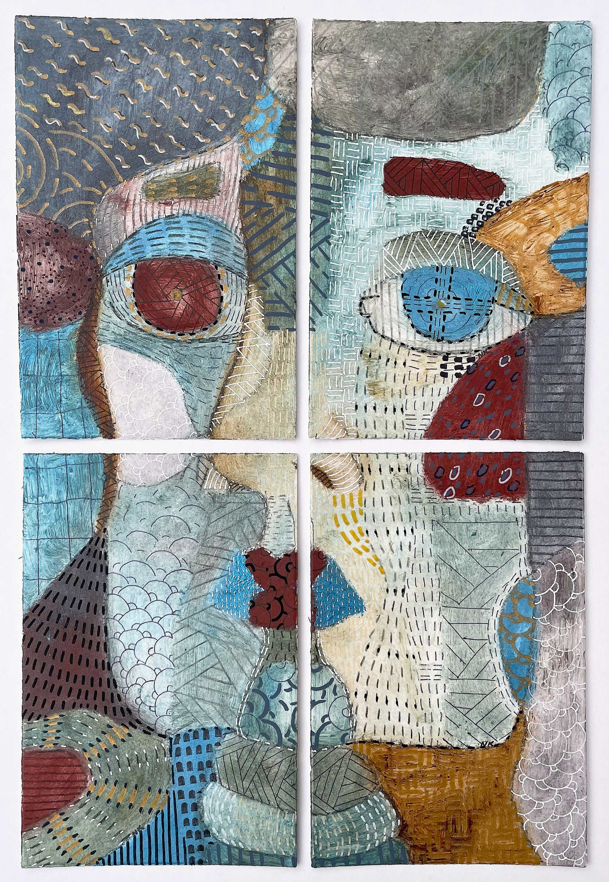 | über PAT in diesen Werken der Serien untersuche ich die vielschichtigen Strukturen menschlicher Erfahrung und Identität sowie den Einfluss der inneren Struktur auf die Welt um uns herum. [WIEDERKEHR] offenbart die Rückkehr des Überwundenen und die Zyklizität innerer Prozesse. [JA ORA NA] klingt wie ein Versprechen des Lebens, stellt jedoch die Grenze zwischen Entwicklung und Wiederholung in Frage. [LABYRINTH] greift den Archetyp des Weges als Form der Selbsterkenntnis und inneren Suche auf. [METAMORPHOSE] hält den Zustand des Übergangs, der Transformation von Form und Bedeutung fest. [EINGENÄHT–UMGENÄHT. EINGESCHRIEBEN] untersucht eingenähte und überschriebene Verhaltenskodizes, die sich im Gedächtnis überlagern. [KALEIDOSKOP] demonstriert die Vielfalt der Perspektiven und die Fragmentarität der Wahrnehmung. [WIR] verlagert den Fokus vom individuellen „Ich” zum kollektiven Körper. Zusammen bilden die Serien einen visuellen und konzeptuellen Dialog über die Wechselbeziehung zwischen innerem, kollektivem und umgebendem Raum. In these works from the series, I explore the complex structures of human experience and identity, as well as the influence of inner structure on the world around us. [WIEDERKEHR] reveals the return of the overcome and the cyclical nature of internal processes. [JA ORA NA] sounds like a promise of life, but questions the boundary between development and repetition. [LABYRINTH] refers to the archetype of the path as a form of self-knowledge and inner search. [METAMORPHOSE] captures the state of transition, the transformation of form and meaning. [EINGENÄHT–UMGENÄHT. EINGESCHRIEBEN] explores the sewn-in and rewritten behavioral codes that accumulate in memory. [KALEIDOSKOP] demonstrates the multiplicity of perspectives and the fragmentary nature of perception. [WIR] shifts the focus from the individual “I” to the collective body. Together, the series form a visual and conceptual dialogue about the interconnection between inner, collective, and surrounding space. |